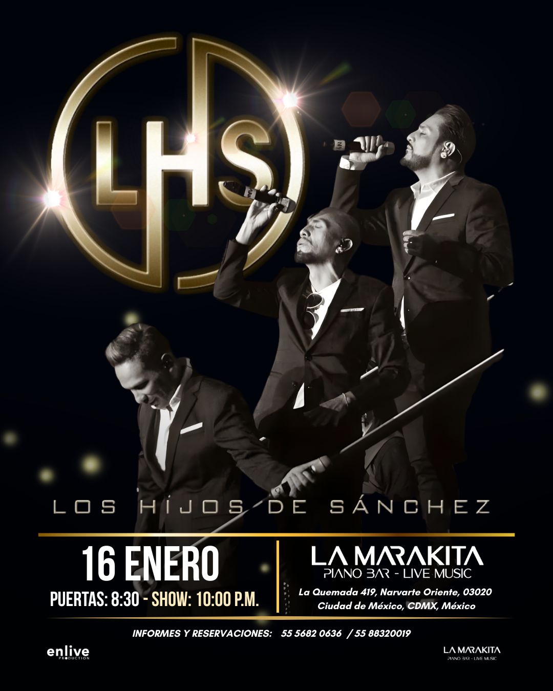 La presentación de Los Hijos de Sánchez este viernes 16 de enero se inscribe como un acontecimiento especial dentro de la vida nocturna de la Ciudad de México, no solo por el regreso a escena de una de las agrupaciones vocales más singulares del pop nacional, sino por el formato íntimo y cercano en el que se reencontrarán con su público. La cita será en La Marakita Piano Bar – Live Music, ubicada en La Quemada 419, a un costado del estacionamiento de La Maraka, donde las puertas abrirán a las 8:30 de la noche y el concierto dará inicio puntualmente a las 10:00 pm. Para quienes deseen asegurar su lugar en esta velada especial, las reservaciones pueden realizarse directamente a los números telefónicos 55 56 82 06 36 y 55 88 32 00 19.
